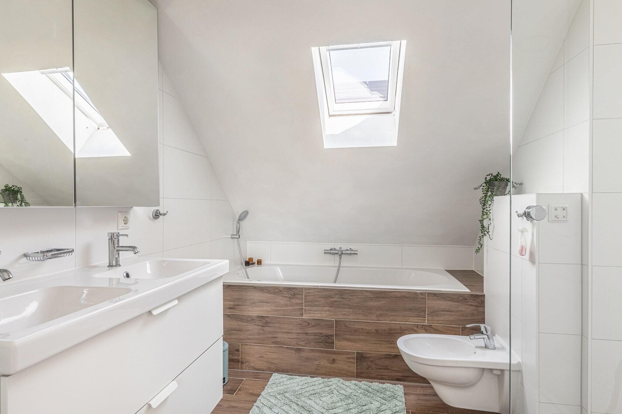 Badkamer (ca. 8m2) (vernieuwd in 2016): ligbad, bidet, dubbele wastafelmeubel, toilet en ruime inloopdouche.