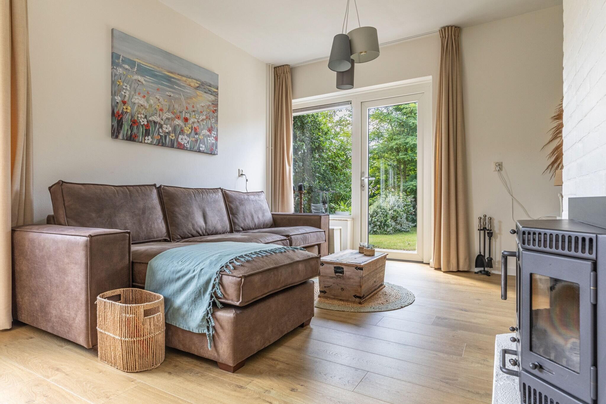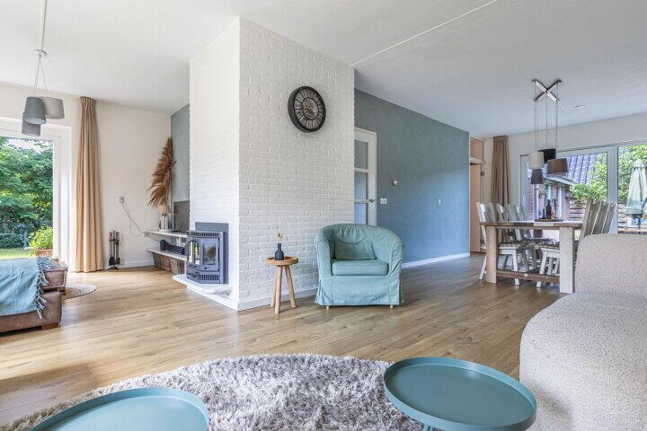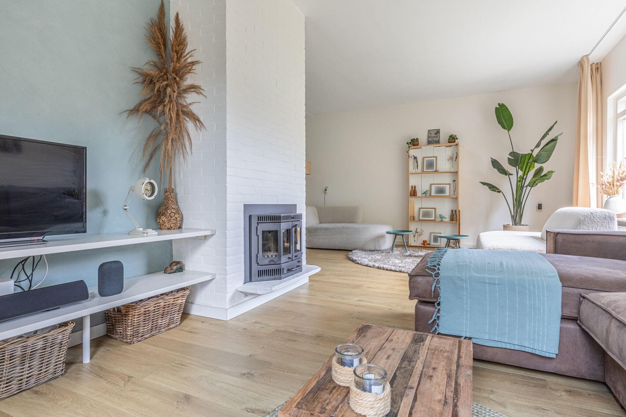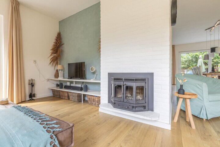 Royale L-vormige woonkamer (ca. 46m2) met veel lichtinval, een sfeervolle houtkachel, een kunststof schuifpui naar de besloten achtertuin, openslaande tuindeuren naar de zijkant en toegang tot de woonkeuken.