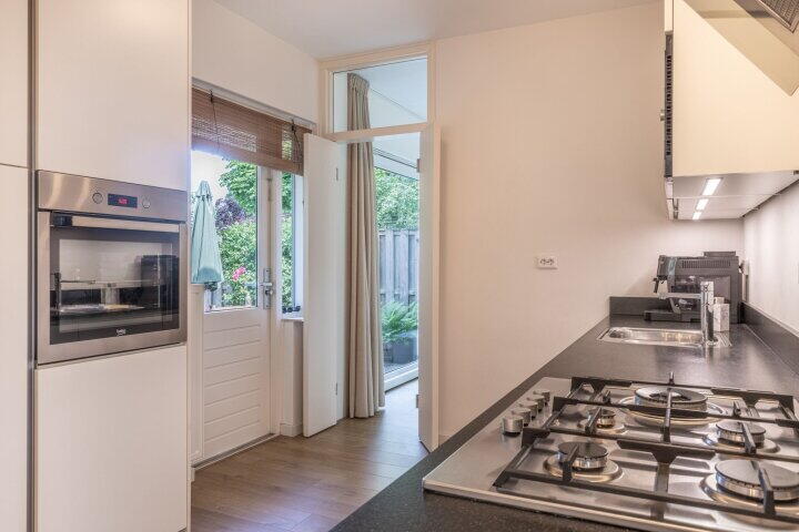 De woonkeuken geeft verder toegang tot de hal, de tuin en de verwarmde inpandige berging/bijkeuken (ca. 14m2) met aansluiting voor wasmachine/droger en een achterdeur naar buiten.