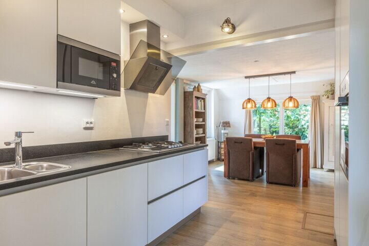 De woonkeuken (ca. 24m2) bestaande uit een kook- en eetgedeelte. De keuken heeft een rechte opstelling met een kastenwand en is uitgerust met inbouwapparatuur: magnetron, oven, 5-pitsgasstel, afzuigkap, vaatwasser en koelkast.